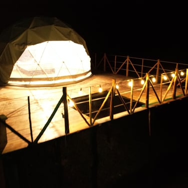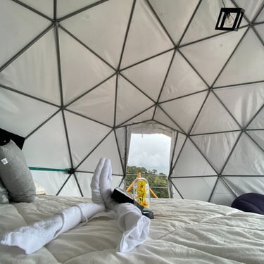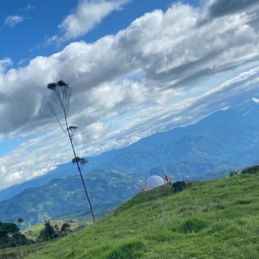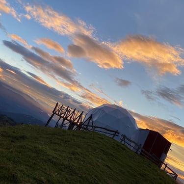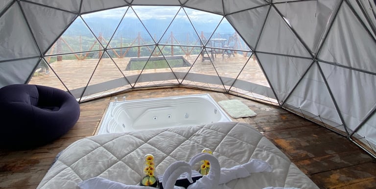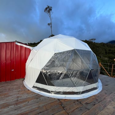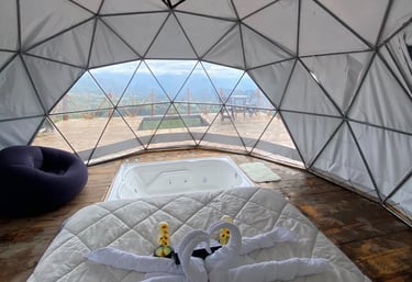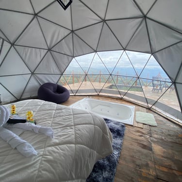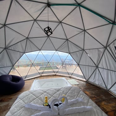 Un espacio total de 60 mts² con Jacuzzi, malla catamarán, cama Queen, Puff, terraza con mesa y baño privado con acceso desde el interior del domo. Vista 360 del norte de Nariño, donde podrás apreciar los Volcanes Doña Juana, Galeras, Cumbal y Azufral.
