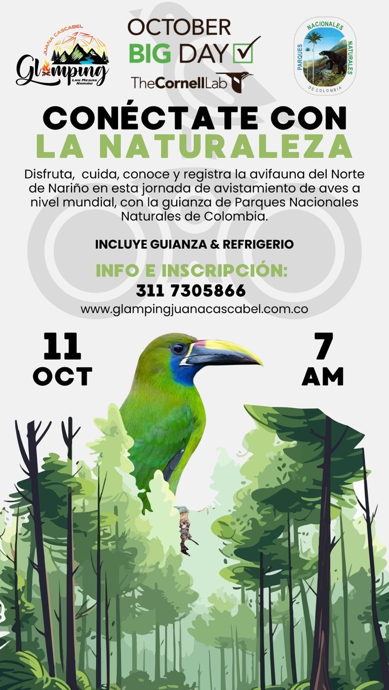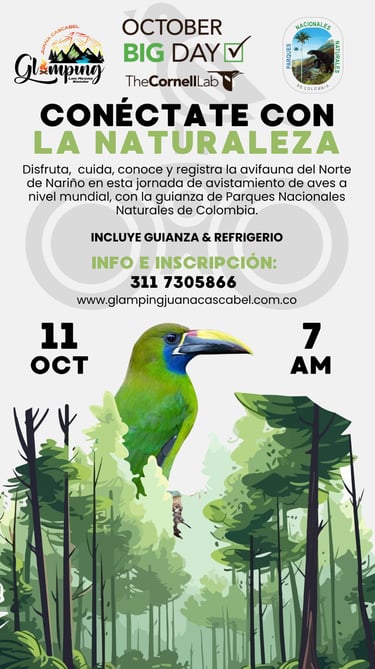 Te invitamos a nuestra primera jornada de avistamiento de aves en nuestra región. Todo esto gracias a Parques Nacionales Naturales de Colombia y Glamping Juana Cascabel. Te contamos que esta actividad es 100% gratuita.